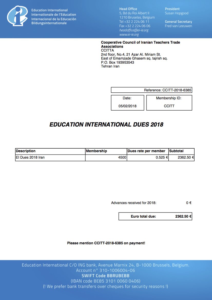 نکته مهم قابل توجه شورای مرکزی تشکل ها و هیئت مدیره کلیه کانون های صنفی معلمان ایران، مسئله مهلت پرداخت است. همکاران توجه داشته باشند که تاریخ ۳۱ ماه مارس سال ۲۰۱۸ میلادی، آخرین مهلت در نظر گرفته شده برای پرداخت حق عضویت کلیه اعضاء آموزش بین الملل است. شماره حساب EI و مشخصات کامل برای ارسال حق عضویت هم در نامه درج شده است.
